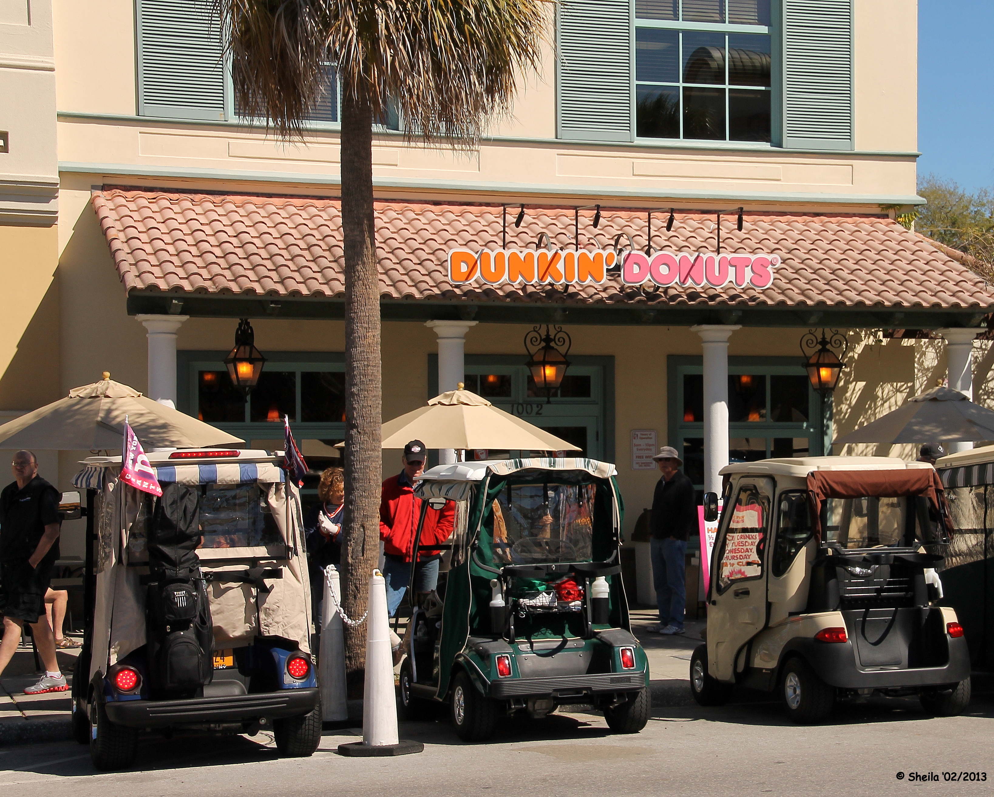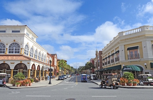 Mochten we ons vervelen, dan is er altijd nog een leuke rit richting The Villages, een van de vele 50+-communities in Florida, maar een héle grote. Op een van de centrale plekken, Spanish Springs Town Square kan je lekker eten. Je ziet er meer geparkeerde golfkarretjes dan auto’s. Stevig gepimpt ook nog blijkbaar.