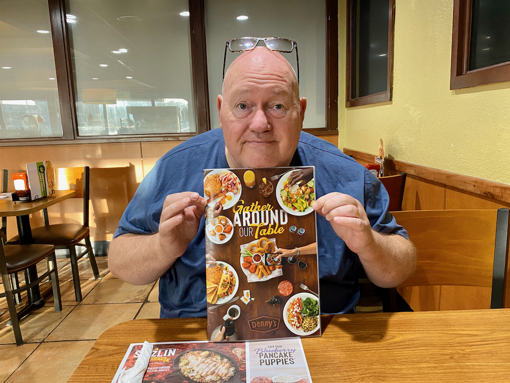Door dat hele gedoe zaten we dus vanmorgen al heel vroeg in de auto en reden we langs de boulevard van downtown Fort Lauderdale. Mooi op tijd voor de zonsopkomst! De zee maakt hier nog behoorlijk grote golven en het niet al te brede strand is wel erg geliefd aan het aantal ligbedden en parasols te zien. Hier en daar lopen al wat mensen hard of wandelen ze op gemakje. Het is al druk op de weg en de dichtstbijzijnde Denny´s is toch een dikke 20 minuten rijden. Zo rond half acht stappen we binnen en krijgen we de bekende grote menukaart aangereikt. Er zijn wat nieuwe dingen, maar wij weten wel wat we willen 🙂 Albert gaat voor de Lumberjack slam en ik neem mijn vertrouwde favoriet, de French Toast slam.