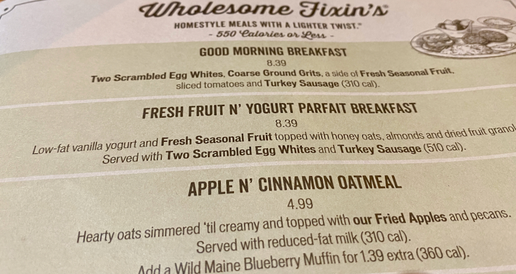 We zetten koers naar Cracker Barrel, een van onze favoriete ontbijtrestaurants, bekend van het charmante winkeltje met truttige artikelen, maar ook van de schommelstoelen op de veranda. Het is er druk, op zaterdag zijn natuurlijk veel mensen vrij. Het is buiten niet meer zo koud als gisteren, maar ze hebben gezellig de open haard aan. En ik had mijn vestje uit, maar heb het toch vrij snel waar aan gedaan tijdens het eten. We kunnen eigenlijk niet echt iets vinden waar geen grits (soort griesmeel) of gravy (van die vette witte jus) bij zit en daar hebben we weinig zin in. Albert bestelt dus een smokehoused sampler en vraagt die twee weg te laten. Hij houdt het bij de ham, hashbrowns, de eieren en de bacon. Als zijn bestelling komt, zit de ham er niet bij en juist de gravy wel. Die kan dus terug. Ik bestel een yoghurtparfait met granola met een blueberry muffin en daar hoort dan weer roerei bij. Het is gewoon een studie hier, die menukaart en het is eigenlijk gewoon een grote vreetschuur, maar wel grappig.