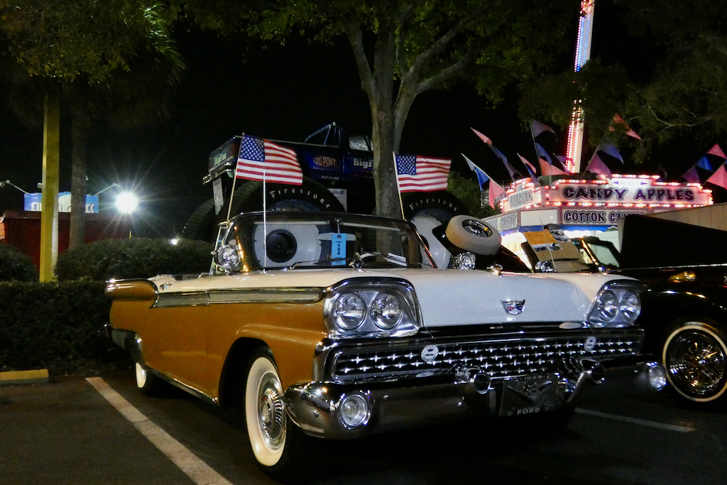 OK, geen winkel meer in geweest na onze middagpauze. Niet geslapen, wel gerust, want dat is af en toe echt nodig met onze krakende lijven. Maar krakende wagens lopen het langst, nietwaar? Nou, we hebben vanavond een mooie verzameling oudjes gezien hoor. En niks kraken, allemaal in topconditie, strak in de lak, glimmen en shinen! Hier vlakbij, in Old Town Kissimmee is elke zaterdagavond een autoshow en op vrijdag trouwens ook, maar dan zijn er de ´muscle cars´. Op zaterdag is er al dertig jaar lang de ´historic car show´ en die wilde we niet missen. We gingen al redelijk op tijd, omdat we niet precies wisten hoe laat de parade zou zijn. We parkeerden vlakbij voor 10 dollar en kwamen terecht in een nep decor van een soort cowboystadje gemengd met kermis. Hartstikke leuk, super toeristisch, maar dat geeft niet, het is hier overal een soort nepwereld. Volgens mij is dit het grootste toeristengebeuren ter wereld alles bij elkaar en je moet ervan houden. Voor een paar dagen is het best leuk!