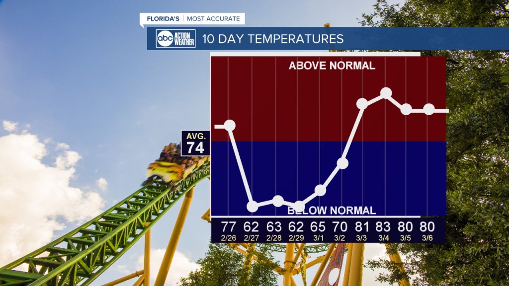 Zie ik daar net op Facebook bij de lokale Piet Paulusma, Denis Philips, dat we alsnog een rollercoaster krijgen. Dachten we de achtbanen te vermijden in Orlando … Maar in dit geval gaat het dus over het weer. Het is hier al een paar weken een komen en gaan van koufronten, wat blijkbaar heel ongebruikelijk is. Ik herinner me nog van onze reis van 10 jaar geleden van Miami naar Dallas dat de obers in de restuarants in New Orleans met de gebreide mutsen op en handschoenen aan liepen. Zo erg gaat het hier niet worden hoor.