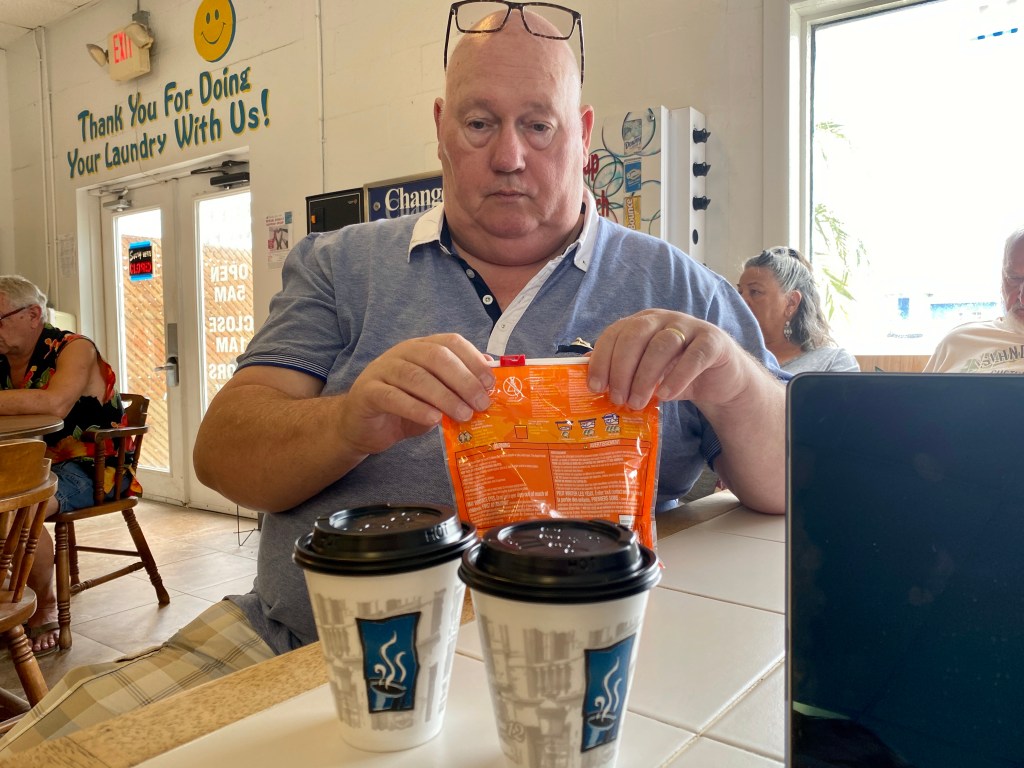 We rijden naar Java Joint Beachside Grill, waar het buiten al helemaal vol zit. We kiezen dus binnen een tafeltje en ontbijten er heerlijk. Het is echt zo’n strandtent, waar het hier vol van zit trouwens. Flagler Beach is een naam om te onthouden. Het heeft nog de sfeer uit vervlogen jaren, het echte strandgevoel en is gewoon superleuk. Morgen maar eens wat meer foto´s hier maken, hoewel het blijkbaar weer een regenachtige dag moet worden.