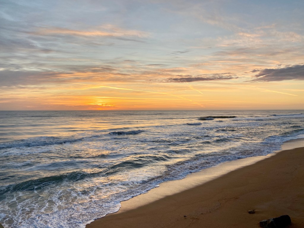 Vandaag was het bewolkt, maar gewoon lekker warm. We hebben een tussendagje. Geen grote plannen, maar kalm aan. We starten wel vroeg, want we willen graag foto´s nemen van de zonsopkomst. Als ik Albert om kwart voor zeven naar buiten hoor gaan, schiet ik als een speer in de kleren en ga er achteraan. Zo maak ik al direct een paar mooie plaatjes van hem als hij al aan de overkant van de weg op het dek staat wat bij het motel hoort. Hebben ze goed gedaan, zo’n privé plekje om van de zee te genieten. Het is erg bewolkt, wat zorgt voor mooie kleuren, al komt de zon niet als een mooie bol op. We genieten er in elk geval echt van. De pelikanen dobberen op de golven en scheren vlak over de zee een aan de vloedlijn loopt een kleine vogel steeds snel de zee in om wat dingen op te pikken en gaat vlug weer terug als de golf weer komt. Zo komisch.