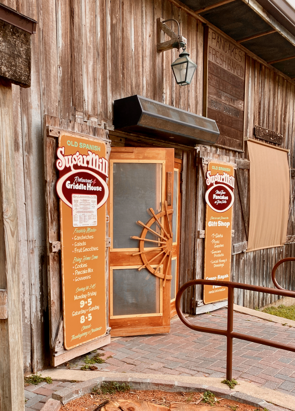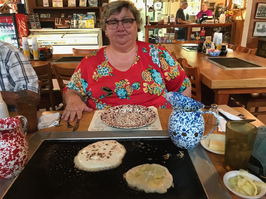 We besluiten dat we nog kans genoeg hebben om manatees te zien en gaan eten in de Sugar Mill. Dit oude restaurant staat bekend om het All-you-can-eat-pancakes concept. Je hebt een hele bakplaat in je tafel, je krijgt twee kannen met verschillend beslag en kan er allerlei dingen bijbestellen. We kiezen voor ham, bacon, appel, banaan en pecannoten. Drie verschillende siropen, waaronder honing en maple, staat op tafel en er komt ook wat boter mee. En zo gaan we samen pannenkoeken bakken om onze trouwdag te vieren. Het was best lekker en gezellig! En een stuk goedkoper dan menig ander etentje om deze dag te vieren 🙂 Voor 32 dollar inclusief de al op de bon gezetten ´gratuity´, de fooi de je normaal betaalt voor je bediening, kan je geen buil vallen.