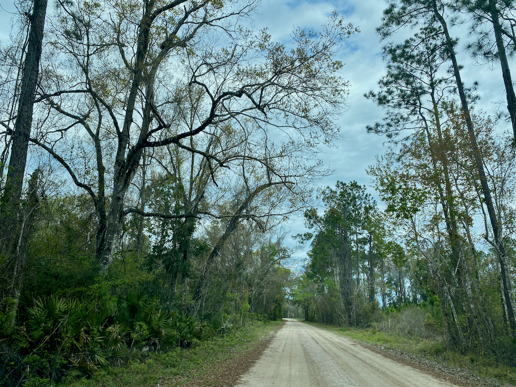 Al na een goede 20 minuten besluit ik dat we de Heritage Scenic Highway gaan rijden richting Hastings. We belanden na het kleine dorpje Espanola, schattig met van die kronkelige bomen met Spaans mos, direct op de Old Dixie Highway. Ik kan je vertellen: dat klinkt romantischer dan het is. Een groot, breed zandpad met in het midden nog van die oude klinkers waar ooit een weg was. En dat gewoon een 11 mijl lang. Volgens Google Maps doe je daar 23 minuten over, nou, in ons tempo was het bijna een uur hoor. En wat je dan ziet? Bomen, heel veel rechte, aangeplante bomen. Eén eekhoorn en een vlinder. Dat was het wildlife onderweg. Maar ok, ik snap het, een klinkerweg is erfgoed, die hebben ze nu niet meer.