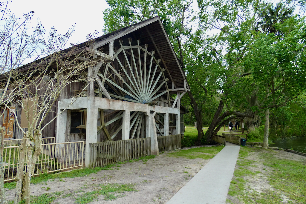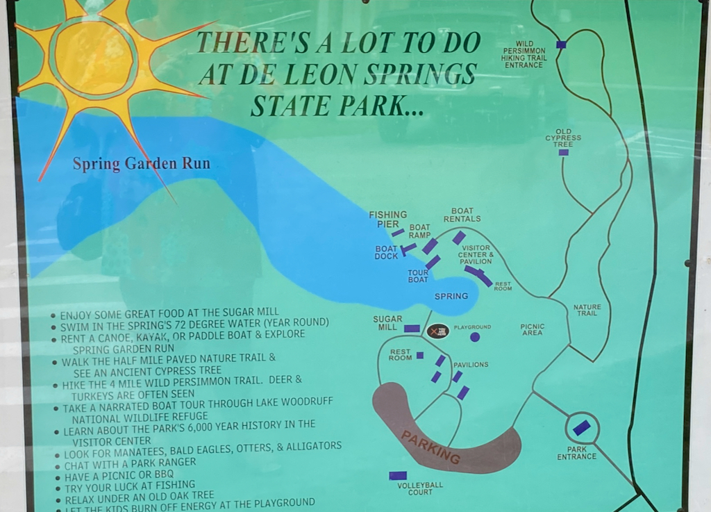 Dan naar het Ocala National Forest, ook allemaal scenic, leefgebied van onder andere de Black Bears of Florida. We rijden door een paar helemaal leuke stadjes, daar houden we van. Auto’s kijken, huizen kijken, veel mooie kerkjes en vooral het platteland. Met ranches, oude meuk, hier en daar een paard en een koe. Ons ding. Maar die scenic highway is net dat zandpad. Lang en recht en met veel bomen, alleen kon je er veel harder rijden. Geen aanrader wat ons betreft. We eindigen dit wonderlijke avontuur in De Leon Springs State Park waar we 6 dollar betalen om binnen te komen. Er zijn enorme bomen met Spanish Mos, er zijn vrouwen aan het zwemmen in natuurwater en je kan er een boottocht maken. Er zitten alligators én manatees (zeekoeien) en die laatste willen we wel zien. Maar dan, rond 1 uur, begint het hard te waaien en er komt regen.