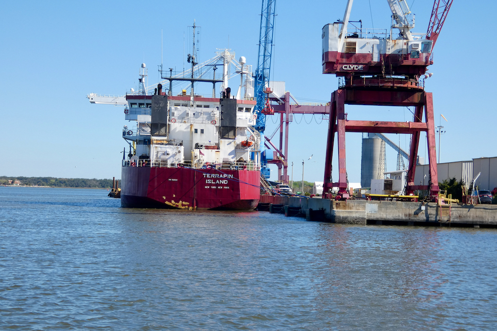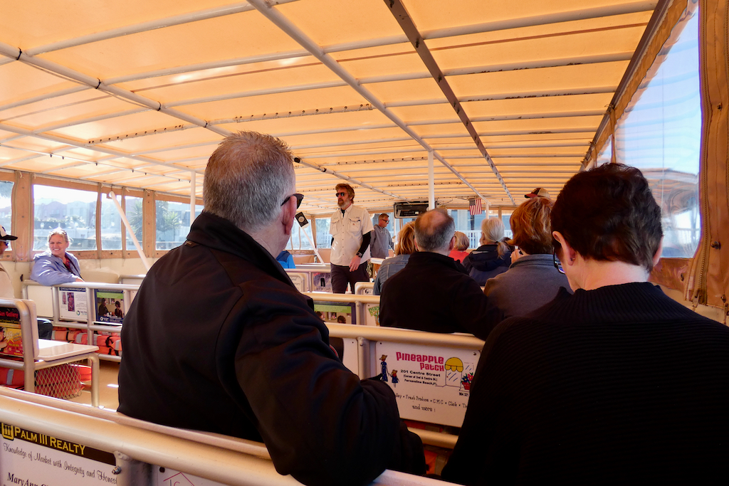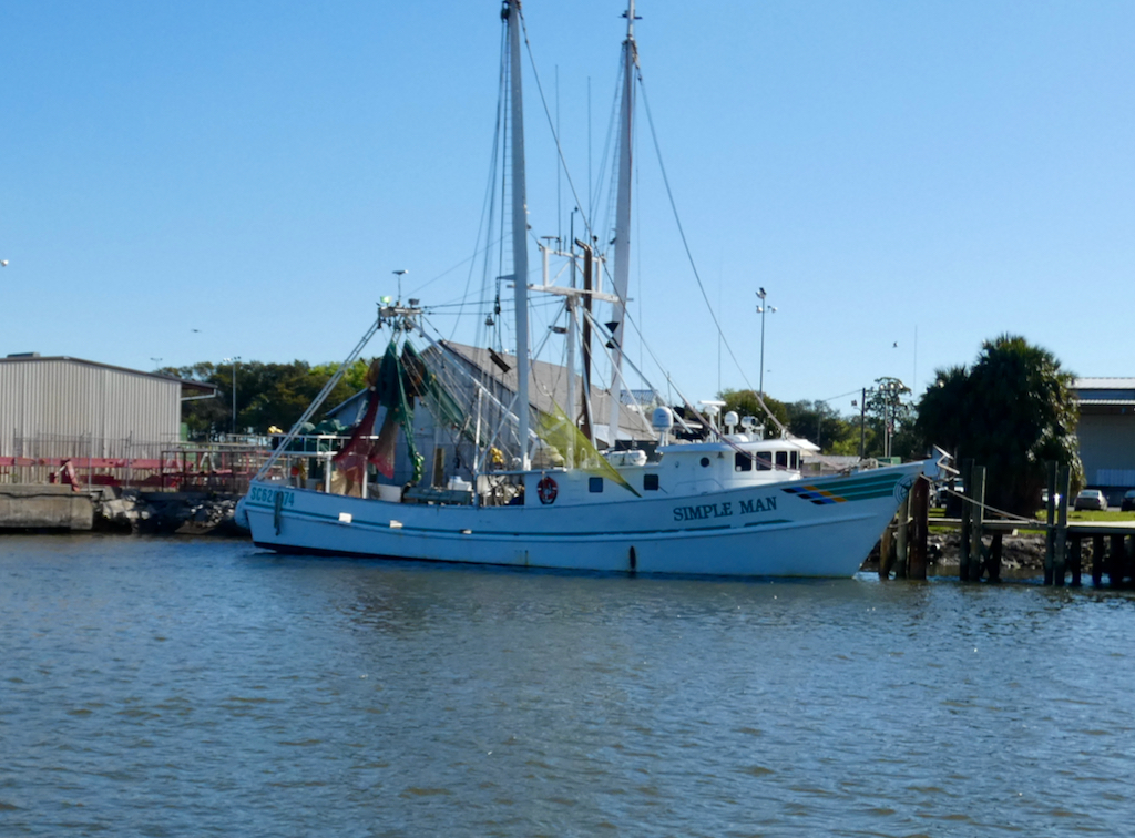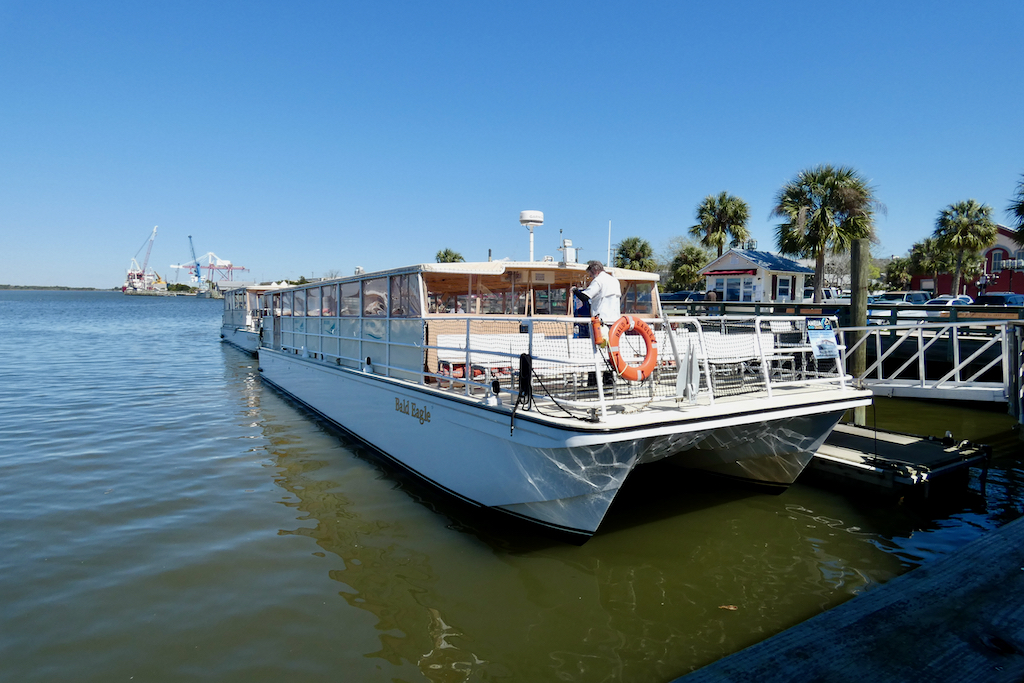 Het ontbijt gebruiken we vandaag voor het eerst in het hotel en dat bevalt prima. Echt goed verzorgd, vers gebakken, keus uit eieren, worstjes, hashbrowns, pancakes, allerlei muffins, croissants, bagels en fruit. Daarbij sapjes, koffie, melk en thee. Keurig en onbeperkt. Na het ontbijt trekken we de schoenen, vesten én jassen aan, want het is weer berekoud met hooguit 8 graden. We hebben een reservering op de Bald Eagle van Amelia River Cruises. De boot is wel netjes met zeil winddicht gemaakt en als we met nog 55 anderen aan boord gaan, blijken er kisten met dekens te staan voor wie het echt koud heeft. De echte die-hards zitten zelfs op het open voordek, maar vooral Albert blijft liever achter het zeiltje. Ik wissel veel af, soms zit ik bij hem op het bankje, maar vaak loop ik ook naar achteren waar een paar zeilen open zijn, zodat ik foto´s kan maken.