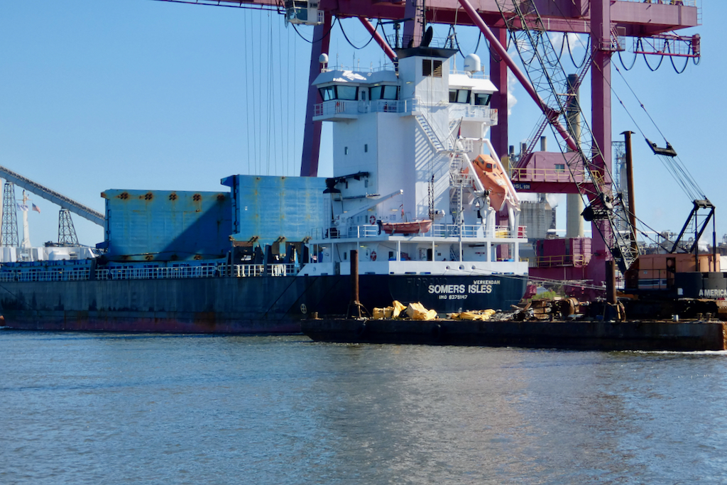 De kapitein is een beetje een slordige prater, maar gelukkig wordt de microfoon al snel overgenomen door Bob. Hij vertelt veel en wat hij vertelt is erg interessant. Het gaat al direct over de teruggelopen vangst van garnalen hier op het eiland, met name door de import uit landen waar dit ´seafood´ gekweekt wordt op farms. Vol van anabolen en steroïden om zo snel mogelijk grote gamba’s te hebben. Mmmm, dat doe je toch anders denken over zo’n lekkere schaal gamba’s en ajillo of van die coconut schrimps hier. Het heeft ook veel banen gekost hier. Als we verder varen, zien we een schip uit Brazilië, maar grappig genoeg staat er op de achterkant met duidelijke letters ´Werkendam´. Albert is de enige die begrijpt waarom ik dat zo leuk vind. Nederland fabrikaat!