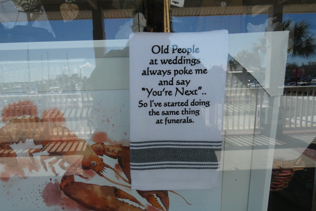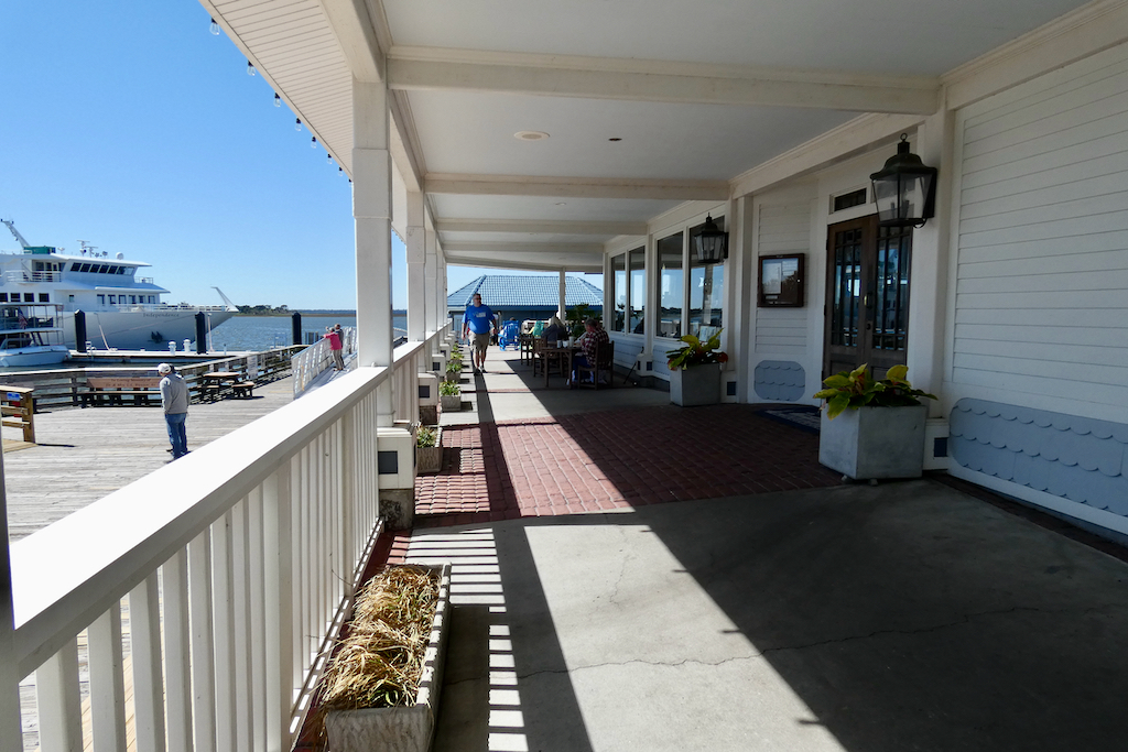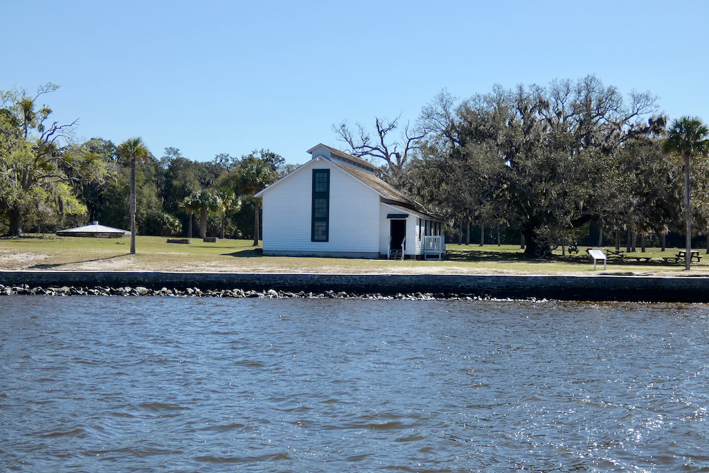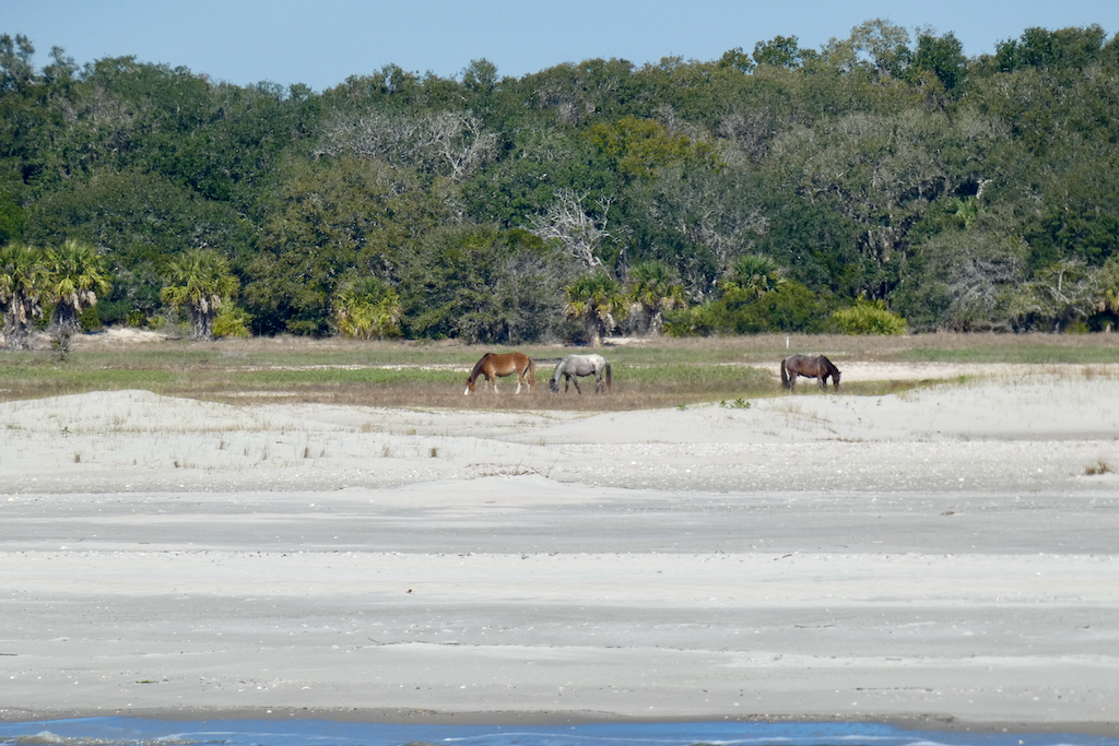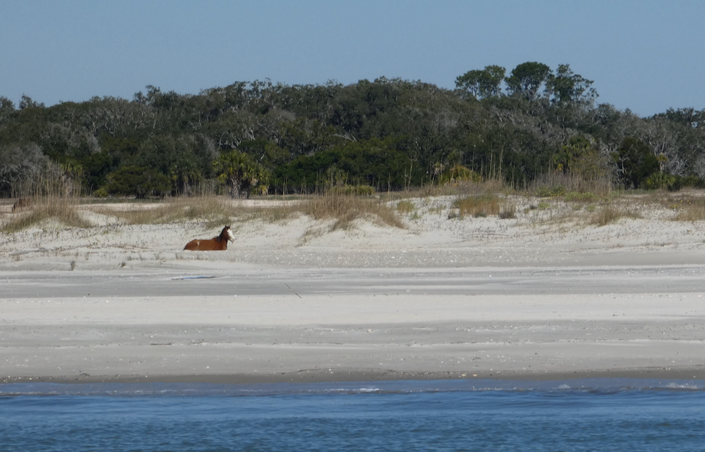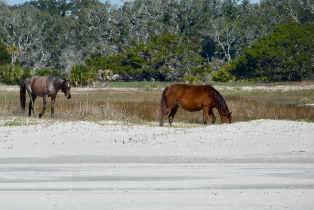 Het eiland kent enorm veel wildlife, dieren kunnen er ongestoord wonen, zonder last te hebben van de mens. Slangen, alligators, panters, zwarte beren, herten, noem maar op, het zit er allemaal. Opvallend zijn de wilde paarden, die niet echt wild zijn, maar achtergelaten polo pony’s zijn van de rijke families, gekruist met eveneens achtergelaten grotere rassen als Clydesdales, Shires en Percherons die weer anderen meebrachten als werkpaarden. Ondertussen zijn ze wel verwilderd, want het enige wat de NPS doet is ze elk jaar proberen te tellen. Ze scharrelen hun eigen kostje bij elkaar en worden zo’n 12 tot 15 jaar oud, wat veel minder is dan paarden in gevangenschap. We zien er een aantal bij en op het strand. Voor wie sportief is, het eiland is te bezoeken met de ferry vanuit St. Marys, maar je zal moeten wandelen, dat is de enige manier om je te verplaatsen. En te laat terug? Jammer, maar de ferry vertrekt. Alleen de echte gelukkigen kunnen er logeren. Er wonen dus nog wat nazaten van de rijke families, waaronder de Ferguson´s. Lucy´s kleinzoon werkt er keihard, hij bezit met zijn gezin de Greenfield Inn, waar in totaal 37 gasten kunnen logeren, omringd door alle luxe, maar wel in kamers die nog zijn zoals een eeuw geleden. De chef is een van de beste koks van het land en heeft onlangs haar eigen kookboek uitgegeven. Voor zo’n 700 dollar per nacht wordt je met de boot vanaf Amelia Island gebracht, maar dan is het eten ook inclusief. We zagen vanmorgen een groep gelukkigen vertrekken van dezelfde steiger als wij los gingen.
