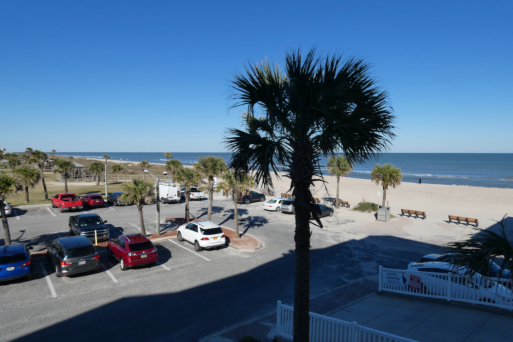 Voor het eerst zitten we dit keer gescheiden, Albert op de kamer, ik in de lobby. We hebben een hele lekkere kamer in het Seaside Amelia Inn, echt met een Queenbed (lekker knus dicht bij elkaar) en een bankstelletje met twee televisies, maar zonder tafel of bureau om aan te schrijven. En zelfs een heus balkonnetje met uitzicht op de oceaan. Maar daar is het nu wel erg koud voor! Het was vanmorgen 7 graden bij vertrek uit Flagler Beach. We besloten eerst maar eens een eind te rijden nadat we alles ingepakt hadden. Ballentent trouwens, de eerste dag was er keurig opgeruimd en lagen er schone handdoeken, gisteren is er gewoon niks gedaan. Dat levert minpunten op bij booking.com. Voor het leuk vindt, ik ga de reviews online zetten, zie bovenaan het blog.