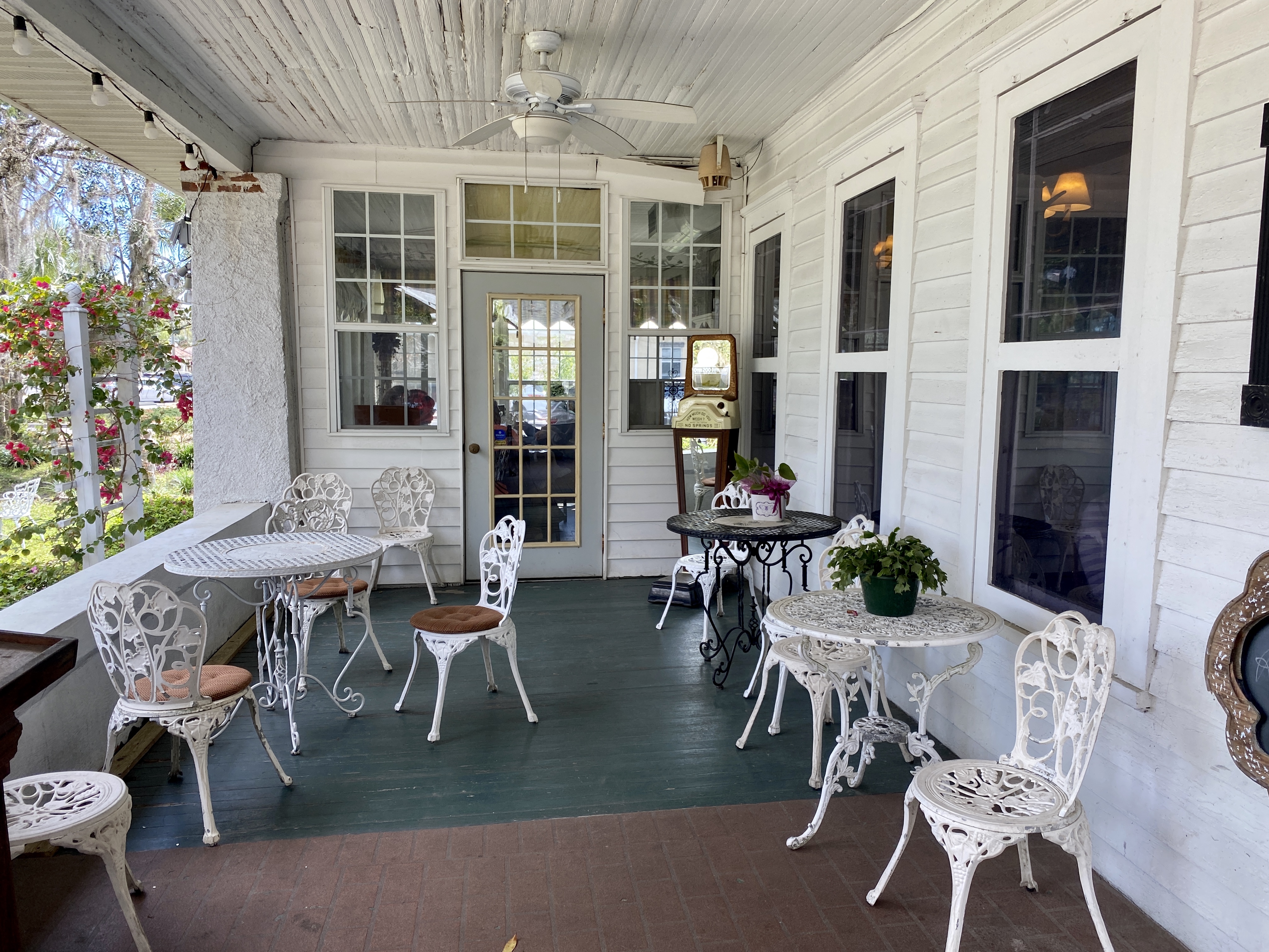 Daarna gaan we naar ´Historic Downtown Ocala´. Het is overal hetzelfde, men bouwt moderne gebouwen in een oude stijl, zet wat van die antiek ogende lantaarnpalen en parkeermeters neer en dat is het geschiedenis. We vinden de huizen die wat verder van het centrum staan en duidelijk wel zo rond een eeuw oud zijn, veel en veel leuker. Dat zuidelijke, met hout en soms ook baksteen met die gezellige veranda’s en trappetjes met hier en daar al bloeiende bloemen, daar geniet ik enorm van! Ik vertel Albert over het restaurant in dat sfeertje wat de zusters van de ijssalon ons adviseerden, the Ivy House in Williston. Het is een dik half uur rijden, maar wel door het hartje van Ocala paardenland. Daar is op dit moment Live Oak International bezig, maar ja, geen paarden he? Gelukkig vindt hij de ranches en landerijen wel leuk om te zien.