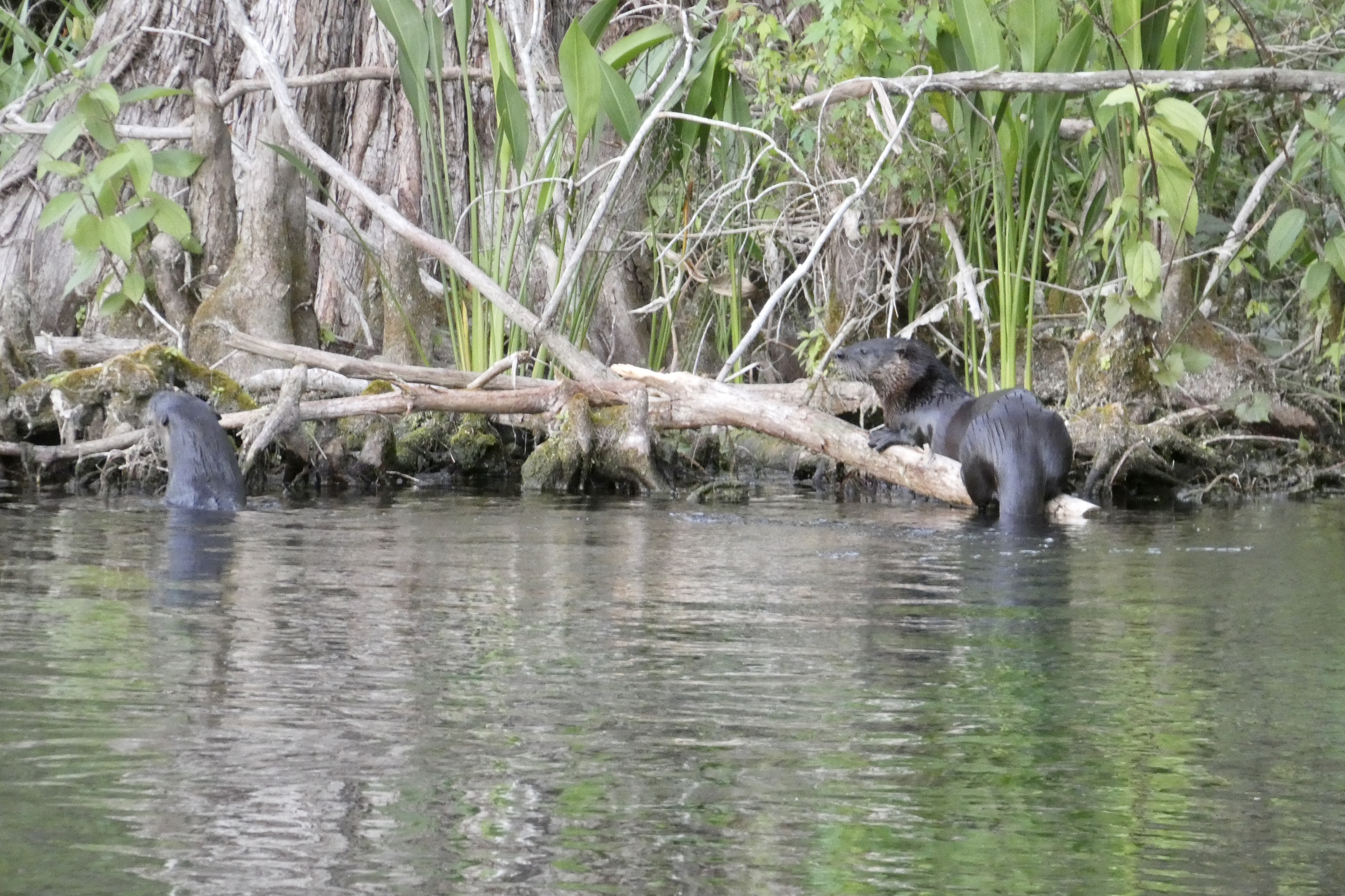 Bij Swampy´s Bar en Grill is het druk, heel druk. Het is er ook superleuk, direct aan de rivier die hier ook uit de bron achter het dorp ontspringt en dus ook water heeft van 72 graden. Er wordt druk gevaren met kajaks, pontoonboten en paddels. Zo leuk om te zien dat de hondjes gewoon mee gaan op zo’n plank. We eten weer heerlijk, Albert kip en ik vis en besluiten dat dit gewoon een hele lekkere vakantiedag was met een perfecte temperatuur van een graadje of 22. Zo willen we ze wel vaker. Net voor ons vertrek ziet Albert ineens dat er veel mensen naar één plek kijken en dus hij haalt hij de camera uit de auto om de twee spelende otters vast te leggen. Dat is toch super? Vakantie!