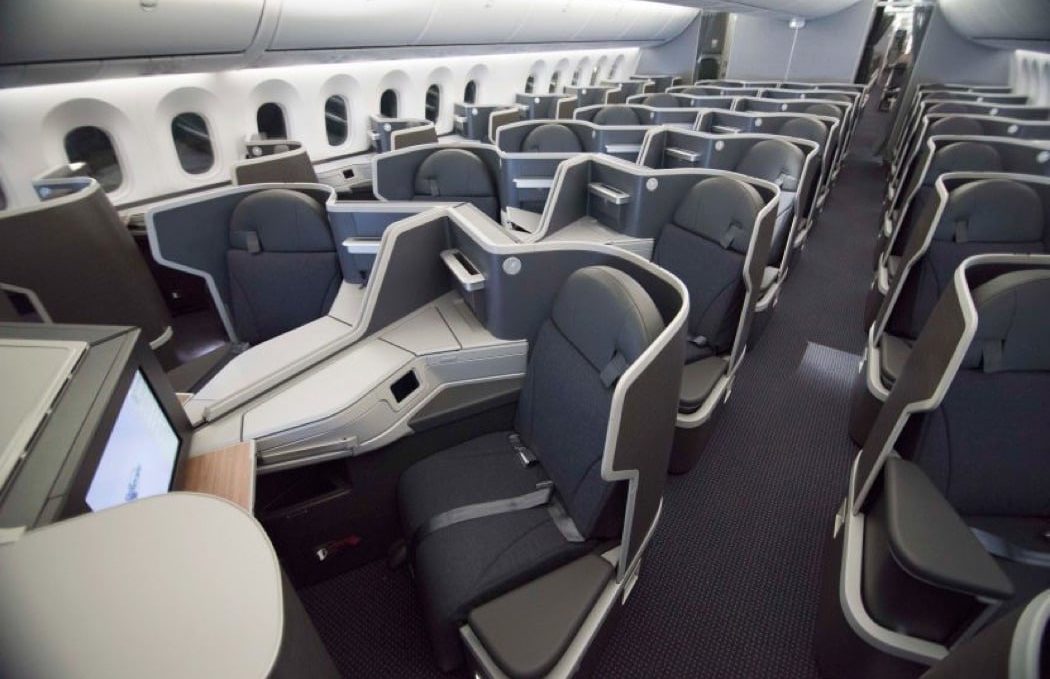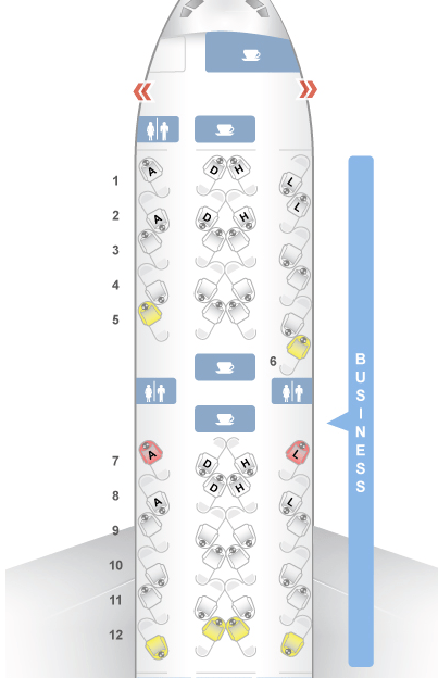 We kiezen voor stoel 7D en 7H in het midden, aan de zijkanten zit je alleen, dat is niet gezellig. We zitten dan recht achter de galley, zeker op de terugweg lekker als je niet kan slapen. Kan je altijd lekker even koffie of wat anders halen. Ook dichtbij de WC, maar als nadeel dat anderen ook bij jou langskomen, maar vooruit, je zit niet precies met je kont half in het gangpad. Mocht het op de heenweg niet bevallen, dan kunnen we wellicht voor de terugweg nog wijzigen, want het is best een hele grote business class. Voor het stuk op deze foto zitten nog zes rijen.