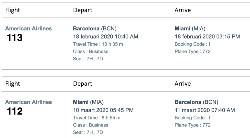 We vliegen met een Triple 7, een andere naam voor de Boeing 777 van American Airlines. Uit het hoofd vlogen we ooit een keer eerder met een dergelijk toestel van New York naar Amsterdam met KLM. We kiezen als vanouds voor business class, met ons postuur en Alberts pijnlijke lijf voor ons de enige keus op lange vluchten. Heel eerlijk? Konden we anders, dan gingen we ook wel vaker! Maar als je dan toch ervoor kiest en betaalt, dan kijk je er ook gewoon enorm naar uit. Pure verwennerij en onze herinnering aan de enige American Airlines vlucht, ook naar Miami in 2010, vanuit Londen, is geweldig. Enorm veel ruimte en comfort, lekker eten en vriendelijk personeel. We gaan er weer voor.